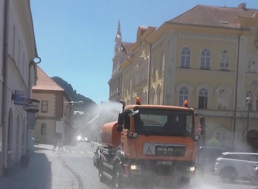 Sprcha z kropícího vozu v těchto horkých dnech osvěžuje bílinské ulice. Městské technické služby kropí náměstí a silnice ve všech částech města, pomáhají tím snížit prašnost i teplotu.