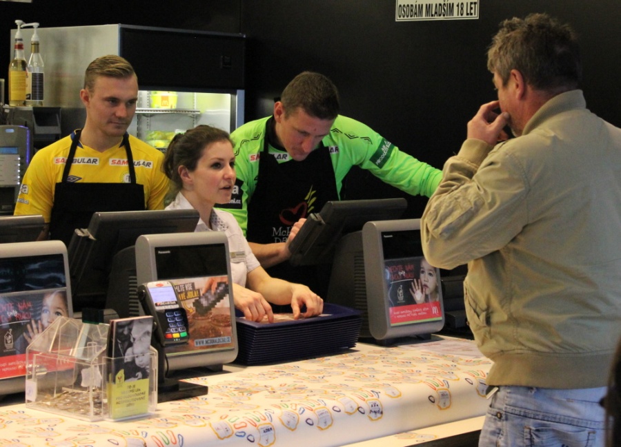 Od 12:30 až do 14:00 obsluhovala teplická pětice přicházející zákazníky v rámci charitativní akce McHappy Day. V rámci této akce si zákazníci mohli zakoupit samolepku Pomocná ruka, výtěžek z prodeje těchto samolepek jde na financování ubytovacích kapacit pro dlouhodobě nemocné děti a jejich rodiny. Prodej samolepek se rozhodl podpořit Fotbalový klub Teplice nejen účastí hráčů, ale také další motivací pro zákazníky. „Každý, kdo si během čtvrteční akce zakoupil samolepku Pomocná ruka dostal k ní od našich hráčů vstupenku na zápas Teplice – Jablonec,“ vysvětluje podporu marketingový manažer FK Teplice Martin Kovařík.
