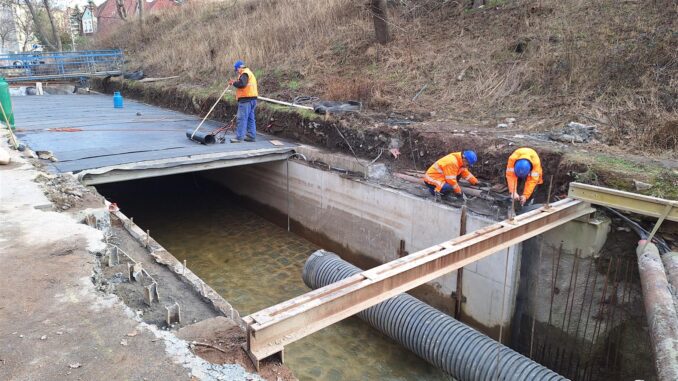 Pět set dvacet čtyři metrů koryta zakrytého potoka Bystřice prochází opravami. „Aktuálně pracujeme na čtyřech úsecích z celkových pěti. V současné době na prvním úseku odbouráváme stávající stropní konstrukce a na části úseku provádíme dobetonování nového stropního krytu. V dalším úseku připravujeme staveniště pro přeložku inženýrských sítí. V těchto dnech z důvodu zvýšených průtoků vody neprovádíme práce v korytě vodního toku, ale pouze na povrchu,“ vysvětluje mluvčí Povodí Ohře Dana Zikešová a dodává, že stavebními pracemi budou zachovány kapacitní parametry zakrytého potoka.