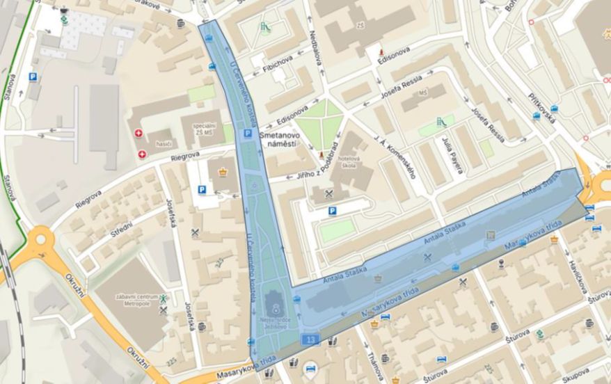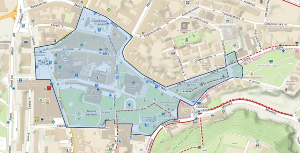 Centrum: Benešovo nám., U Radnice, nám. Svobody, Dlouhá, Papírová, Rooseveltova, Lázeňský sad, U Císařských lázní, Poštovní, část Havlíčkových sadů, Lipová od divadla až k Havlíčkovým sadům, včetně prostoru kolem památníku synagogy, U Císařských lázní a Školní.