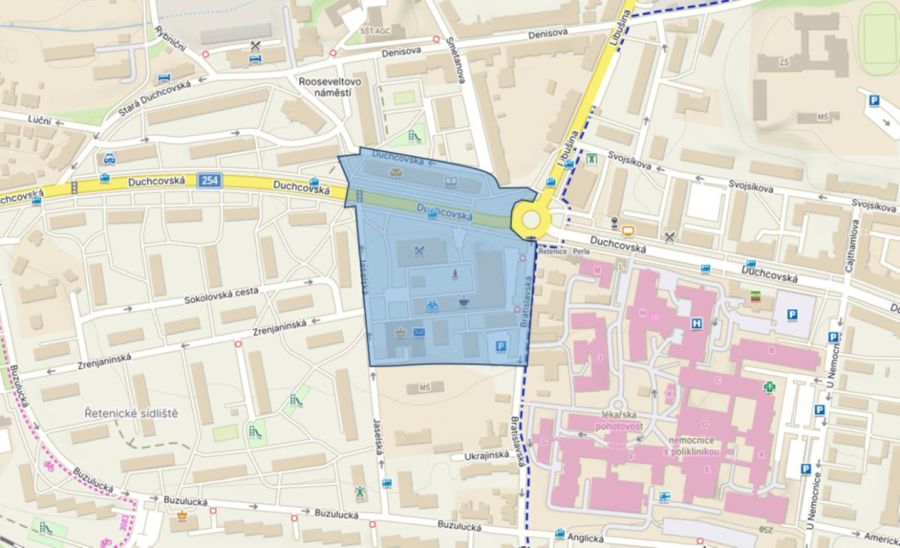 Řetenice: Duchcovská, od křižovatky s Libušinou po Rooseveltovo náměstí, z obou stran desetipatráku, Jaselská včetně celého areálu Perla, Bratislavská a Duchcovská.