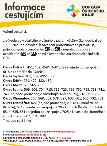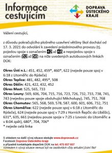 Kvůli stále trvajícímu uzavření škol budou od 17. března do odvolání dočasně zrušeny takzvané školní autobusové spoje a platit bude prázdninový provoz. Kraj tím reaguje na současná opatření proti šíření koronaviru.